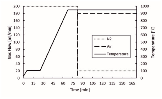The proximate analysis of the biochar and nut coke samples was done with the TGA device used in the thermogravimetric analysis and by mass spectrometry of slow pyrolysis. The program used to determine the moisture content, volatile matter, and ash content was designed from the basis of the program reported in Cassel and Menard, 2012 [18]. The program is presented in Figure 2. N2 was used as an inert gas in the experiments at a flow rate of 200 mL/min until the volatile matter content was determined at 950 °C. After determination of the volatile matter content, the protective gas flow rate was decreased to 20 mL/min and air flow was elevated from 0 to 180 mL/min to determinate the ash content. At this stage, the temperature was kept constant at 950 °C. The sample mass in the experiments was approximately 200 mg.