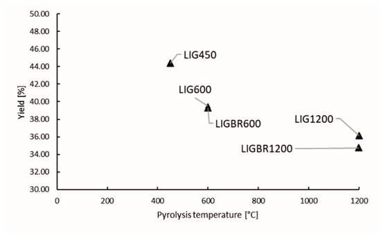 Lignin char yields are presented in Figure 3. “LIG” refer to raw material hydrolysis lignin, “BR” refers to briquette, and the number in the suffix stands for the final temperature in the pyrolysis process. According to results, briquetting before pyrolysis does not have considerable impact on the char yield. On the other hand, temperature of the pyrolysis process can be observed to have more significant impact on the char yield than briquetting. The drop in char yield is higher when elevating the pyrolysis temperature from 450 to 600 °C than when elevating the temperature from 600 to 1200 °C. This can be explained by the broad lignin decomposition stage starting from 200 °C and ending approximately at 550 °C. This is the temperature range in which most of the oxygen-containing compounds and a large portion of the hydrogen-containing compounds are released from lignin. After the decomposition stage, the aromatic clusters start to combine with each other via cross-linking reactions [17].