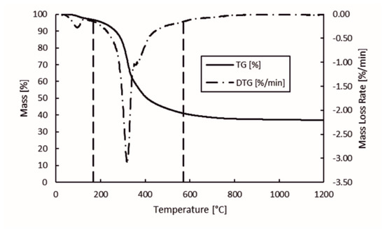 The mass loss and mass loss rate of hydrolysis lignin during pyrolysis in the temperature range of 28–1200 °C is presented in Figure 4. The left y-axis corresponds to the mass percentage during pyrolysis, right y-axis is the mass loss rate of the sample, and the x-axis is the temperature. Vertical dashed lines represent the start and end of the degradation stage. The threshold mass loss rate up until the degradation stage was determined based on the data set. The resulting 0.15%/min mass loss rate was the threshold. According to the chosen threshold, the mass loss rate at the beginning of the degradation stage was determined to be 168 °C, while at the end of degradation stage was 572 °C. In Figure 4, the chosen degradation stage looks correct based on the behavior of thermo-gravimetric (TG) and first derivative of the TG (DTG) curves. This is also in-line with previous studies concerning the behavior of lignin under thermal treatment [17,32,33,34]. This is the stage where most of the volatile matter, condensable gas, and non-condensable gas is released.