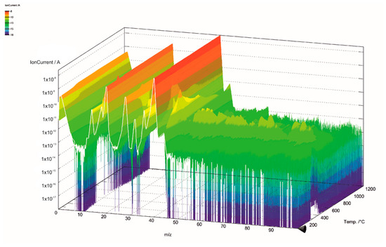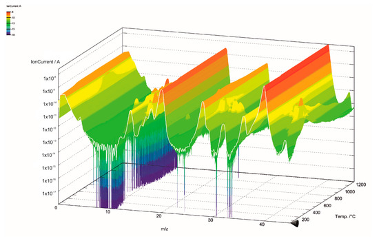 The gas components of the hydrolysis lignin pyrolysis product gas were analyzed with MS connected to TGA. The mass spectra is presented in 3D in Figure 5 and Figure 6. Even though the scan width ranged from m/z values of 0 to 100 (Figure 5), the species in pyrolysis gas were identified between the m/z values of 0 and 45 (Figure 6). This was done for two reasons: the signal intensities were highest in this range and there was less overlapping of different compounds at the same m/z values. However, even in the chosen m/z range, there are various fragmentation ions that may correspond to the one m/z signal, including m/z 16 for O+ in water and for CH4+ in methane; m/z 17 for OH+ and NH3+; m/z 28 for N2+, CO+, and C2H4+; and m/z 44 for CO2+ and C2H4OH+. The m/z signal of 32 could be identified to oxygen (O2), methanol (CH4O), or hydrazine (N2H4); and the m/z signal of 36 to hydrogen chloride (HCl) or methanol-D4, which is an isotopologue of methanol, with each hydrogen atom having an extra neutron. These compounds were determined according to the NIST Chemistry Webbook. The m/z value of 36 could also correspond to tricarbon (C3), which is reported to be a transient species in lignin degradation, as it is cleaved from the benzene ring to obtain saturated or unsaturated hydrocarbons. According to signal intensities as functions of temperature, as presented in Figure 7, tricarbon could be the most probable compound to correspond to the m/z value of 36.
