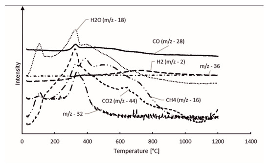 As can be observed in Figure 7, the m/z value of 18 was identified as water (H2O). The m/z signal of 17 (not shown in the Figure 7) was identical to the m/z signal of 18 but with lower intensity, and therefore was also identified as H2O. H2O degrades at two stages, peaking at 106 and 330 °C. The results suggest that the water formation is not only based on the volatilization of the free moisture of the material, but is also formed from degradation of oxygen-containing functional groups [35]. Together with CO2, water is reported to account for the major part of the oxygen elimination from biomass [35]. The CO2 signal (m/z 44) also peaks at 330 °C, however the signal intensity does not decrease as fast as the signal for H2O, and formation of CO2 can even be observed at 900–1000 °C. The CO signal (m/z 28) intensity steadily decreased throughout the pyrolysis process. This is in-line with the previous TG-FTIR studies by Cao et al., 2013, who reported FTIR signals for CO, CO2, and CH4 in lignin pyrolysis product gas at 1200 °C [30]. The CH4 signal (m/z 16) in our study had the highest peak at 330 °C, followed by two less-intense and broader peaks at 387 and 501 °C. The H2 signal (m/z 2) intensity slowly evolved during the pyrolysis, having the highest intensity at 716 °C. This result is in-line with the literature [19].