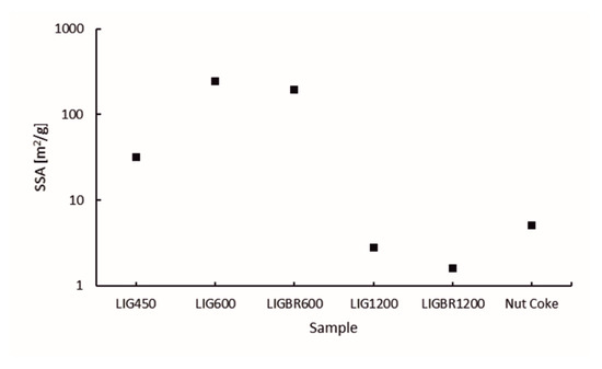 By comparing the different chars to nut coke, it can be stated that LIG1200 and LIGBR1200 samples had pore volume and SSA values most closely resembling nut coke out of all the lignin char samples. Nut coke had SSA and total pore volume values of 5.1 m2/g and 0.00366 cm3/g, respectively, which were more than the corresponding values for LIG1200 and LIGBR1200.