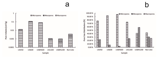 The specific surface area (SSA) of the chars is presented in Figure 8. The pore volume and size distribution of the pores of the samples are presented in Figure 9a,b, respectively. The y-axes in Figure 8 and Figure 9a are presented in common logarithm form to more accurately illustrate the results. The different stages of hydrolysis lignin and their effects on the structure of the lignin char can be easily observed. LIG450 had a moderate SSA of 32 m2/g. According to Figure 9a,b, the mesopores account for 22% of the porosity, while 78% of the porosity comes from micropores. The total porosity of sample LIG450 was 0.01307 cm3/g.