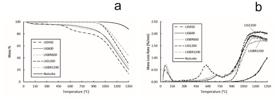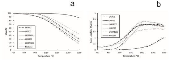 These results, however, include reactions such as vaporization of water and release of volatile matter, which may distort the results. In Figure 11a,b, the TG and DTG data from Figure 10a,b are modified so that the starting point for the TG curve is set to 750 °C, i.e., at 750 °C the mass loss is set to 0%. The mass loss rate is also determined according to this. Using this method, the effect of water vapor release and part of the effect of the volatile release on the results can be ruled out and the starting temperature for the gasification reaction of the chars and nut coke is easier to define. As can be observed from Figure 11b, the volatile matter of samples LIG450, LIG600, and LIGBR600 is released at 750 °C as the reaction rate (DTG curve) remains steady in the range of 0.20–0.25%/min. At this point, the TG and DTG curves of LIG450, LIG600, and LIGBR600 are overlapping. As the temperature is further elevated, the slopes of the DTG curves increase, and since the gasification behaviors for each sample are different, the curves separate from each other. This point is considered to be the threshold temperature range for the gasification reaction.