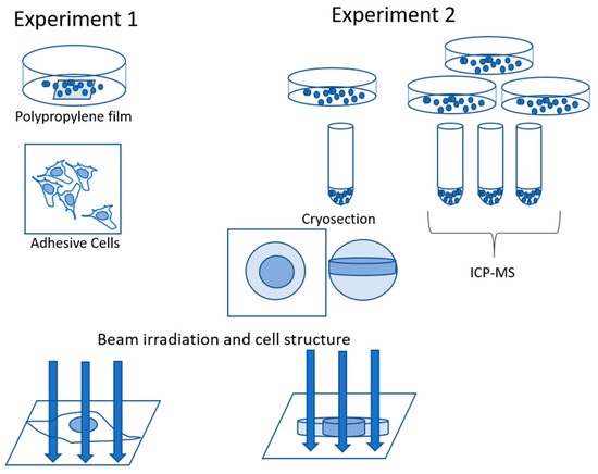 Unlike the above experiment, normal culture dishes (diameter, 6 cm) were used in the following experiments. 3 × 105 cells were seeded onto the dishes, incubated for 24 h, and the medium was replaced with uranium-containing medium. After 24 h of incubation, cells were washed with PBS and collected. The experiment was performed in quadruplicate. Three dishes were used for measuring uranium concentration in cells (uranium uptake experiment). The remaining one dish was used for cryosection specimens. The cells were embedded in the OCT compound and frozen with liquid nitrogen. Then frozen cells were sectioned to a thickness of 2 μm using a cryomicrotome. The slices were placed on polypropylene films and subjected to PIXE analysis. The experimental design is shown in Figure 1.