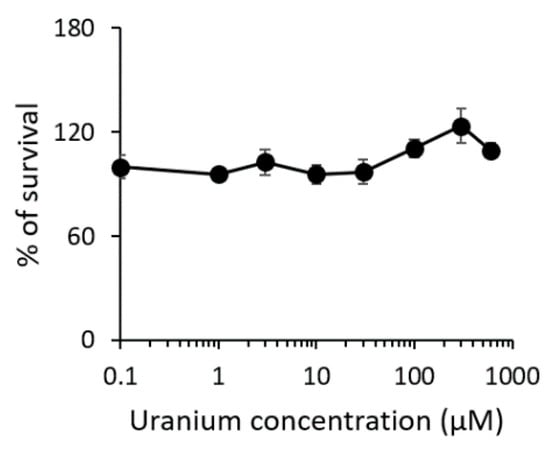 Cells were seeded onto 96-well microplates (2 × 104/well) and incubated for 24 h, and then treated with uranium (0.1–600 μM) for 24 h. Sensitivity to uranium was measured by colorimetry using the alamarBlue (Biosource International, Camarillo, CA, USA), as described previously [].