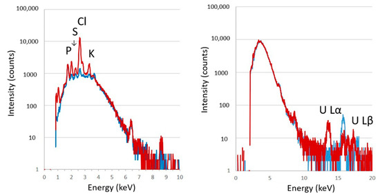 An example of the X-ray spectrum from control and uranium-treated S3 cells is depicted in Figure 3. Chlorine, sulfur, phosphorus, and potassium were detected in both the control and uranium-treated S3 cells (Figure 3, left panel). Clear peaks of calcium were not detected in these S3 cells under the condition of a 0.2-µC integrated charge. The uranium spectrum was confirmed in the uranium-treated S3 cells (Figure 3, right panel). Clear images were obtained for chlorine, sulfur, phosphorus, and potassium in the control S3 cell (Figure 4). Chlorine was distributed throughout the cell. Phosphorus, sulfur, and potassium were distributed in the area closer to the center of the cell, where the nucleus is located than the chloride distribution.