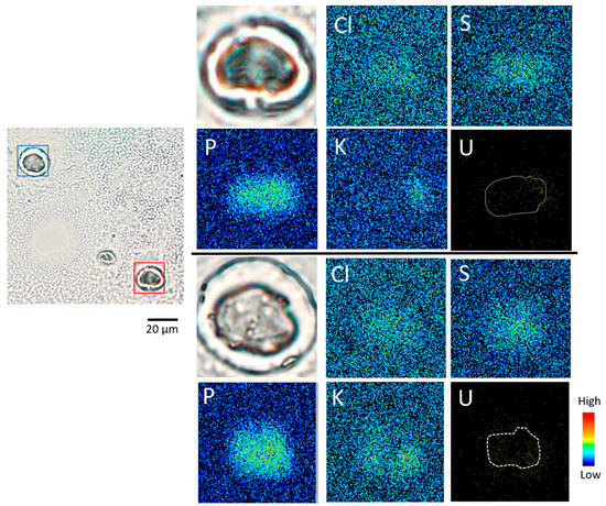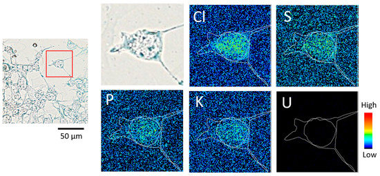 The type of adhesive cell specimens has the advantage of closely resembling a living state. However, the data obtained is the total elemental information of different cell structures in the region of the central part of the cell (Figure 1). Even if uranium is attached to the cell surface, it appears as if it is localized inside the cell. Therefore, a type of cryosection specimen was examined by image analysis to solve this problem. Combining the results of the adhesive type and the section type, it was demonstrated that uranium was distributed inside the cell and localized in the cytoplasm near the cell nucleus. In some cells, uranium was colocalized with phosphorus and potassium. Calcium localization was not observed in the areas of uranium localization under the uranium exposure condition of 100 μM for 24 h. From the two types of cell imaging, it was suspected that sulfur was abundantly distributed in the nucleus, and chlorine was also abundant in the cell surface.