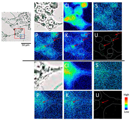 PIXE imaging of uranium-treated S3 cells. (Left panel) Photo of S3 cells exposed to uranium for 24 h. Elemental imaging was performed with the following conditions in the boxed areas: scanning area, 50 μm × 50 μm (red), 25 μm × 25 μm (blue), integrated charge, 0.2 μC, and beam size, 1 μm × 1 μm (Upper panel). Elemental images are in the red boxed area (Lower panel). Elemental images are in the blue boxed area. Arrows indicate colocalization of phosphorus, potassium, and uranium.