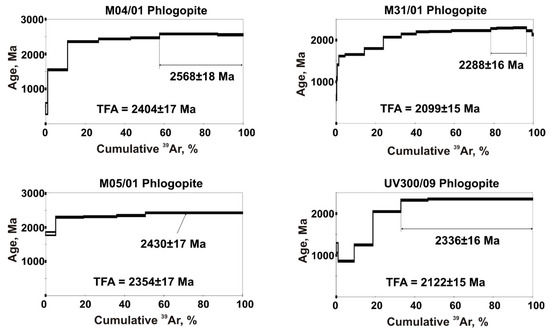 For 40Ar/39Ar dating, there had been selected large plates of a uniformly composed phlogopite, that correspond to the early metasomatic stage (Figure 1). There had been obtained age spectra (Table 1, Figure 2), in which, after moving upwards in the low-temperature section, either mini-plateau of two stages (specimens M-04/01, UV-300/09), or individual stages are seen with extremely high age values, which for specimens M4/01, M5/01 and UV300/09 amounted to 2568 ± 18, 2430 ± 17 and 2336 ± 16 Ma, respectively (Figure 2). The age spectrum of phlogopite М31/01 in a high-temperature section has a prominent mini-plateau aged 2288 ± 16 Ma. These age estimates correspond to the estimates of time, when the material from the mantle entered the crust of superposed fold belts of microcontinents (2.5−2.3 billion years) [49], that subsequently became the parts of the Siberian craton; they are in line with reformation processes in the mantle, and are likely to indicate the time of a major metasomatic event.