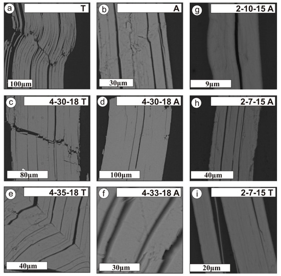 Morphology of original and heat-treated at high temperatures and pressures phlogopites (3 GPa) (BSE-photo, polished compounds). T—phlogopite from Tajikistan skarns, A—phlogopite from skarns of the Aldanian shield; (a,b)original specimens; (c–i)heat-treated specimens. Sp. 4-30-18—specimen, heat-treated at the temperature of 1000 °С during 72 h; sp. 4-35-18—specimen, heat-treated at the temperature of 800 °С during 72 h; sp. 4-33-18—specimen, heat-treated at the temperature of 900ºС during 72 h; sp. 2-10-15—specimen, heat-treated at the temperature of 850 °С during 2 h; sp. 2-7-15—specimen, heat-treated at the temperature of 1000 °С during 2 h.