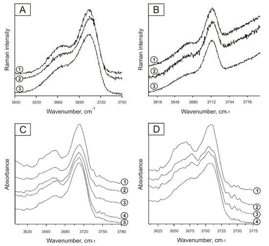 Raman spectra (R) and IR-spectra (A) Raman spectra of original and heat-treated at high temperatures and pressure of 3 GPa phlogopites in the area of stretching vibrations of OH-groups (phlogopite from the Aldanian shield rocks): 1—original specimen; 2—specimen, heat-treated at Т = 850 °С, 2 h; 3—specimen, heat-treated at Т = 1000 °С, 2 h.(B). Raman spectra of original and heat-treated at high temperatures and pressure 3 GPa phlogopites in the area of stretching vibrations of OH-groups (phlogopite from the Kuhi-Lal field rocks (Tajikistan)): 1—original specimen; 2—specimen, heat-treated at Т = 850 °С, 2 h; 3—specimen, heat-treated at Т = 1000 °С, 2 h.(C). Fragments of IR-spectra of original and heat-treated at high temperatures and pressure 3 GPa phlogopites in the area of stretching vibrations of ОН groups (phlogopite from the Kuhi-Lal field rocks (Tajikistan, SW Pamir)): 1—original specimen; 2—specimen, heat-treated at Т = 700 °С, 72 h; 3—specimen, heat-treated at Т = 800 °С, 72 h; 4—specimen, heat-treated at Т = 900 °С, 72 h; 5—specimen, heat-treated at Т = 1000 °С, 72 h.(D). Fragments of IR-spectra of original and heat-treated at high temperatures and pressure 3 GPa phlogopites in the area of stretching vibrations of ОН groups (phlogopite from magnesial skarns of the Aldanian shield): 1—original specimen; 2—specimen, heat-treated at Т = 800 °С, 72 h; 3—specimen, heat-treated at Т = 900 °С, 72 h; 4—specimen, heat-treated at Т = 1000 °С, 72 h.