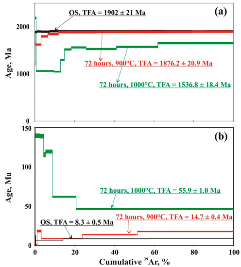 40Ar/39Ar age spectra obtained by phlogopite (a) from the Aldanian shield rocks, (b) from the Kuhi-Lal field (Tajikistan) original and heat-treated at high temperatures and 3 GPa pressure. Parameters of the experiment and the values of integral age (TFA) are written in the figure. OS—original specimen.