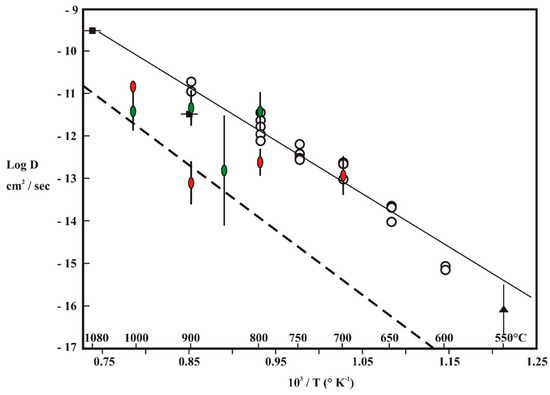 Our experimental data: Green—laboratory experiment duration 2 h and pressure 3 GPa; Red—laboratory experiment: duration 72 h and pressure 3 GPa; the dotted line is designed for a pressure of 30 kbar taking into account the known kinetic parameters of the phlogopite [23] and is characterized by DO = 0.75 cm2/sec and Ea = 284,672 J/mol for 3 GPa (activation volume—14 cm3/mol [23]).