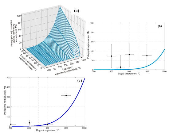 (a) Result of numerical modelling of evolution of the K/Ar isotopic system of phlogopite from magnesial skarns of the Aldanian shield (with 1902 Ma initial age) depending on conditions of the laboratory experiment (temperature and duration) at 3 GPa pressure. Rejuvenation degree of the isotopic system of phlogopite corresponds to the value in million years, by which its integral age decreased in the course of the experiment. Comparison between the results of laboratory experiments 2 h (b) and 72 h (c) long and the numerical simulation results.