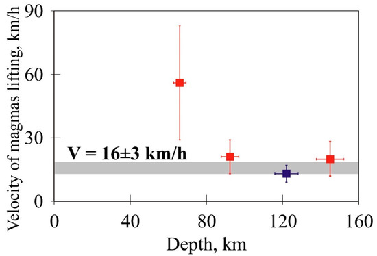 Figure 8 presents a model dependence of the calculated degree of radiogenic 40Ar loss by phlogopite on the ascent rate of xenolith in the kimberlite melt. For each xenolith, ascent had started from the depth of its formation, depending on the estimate of pressure in a state of the last equilibrium (Table 2). An option of rising at a constant rate was considered. The slower the rate, the longer the time for rock heating at the melt temperature (~1000 °С) and, respectively, the greater the loss of radiogenic 40Ar. An optimum ascent rate (Figure 8) was estimated from the intersection of the model value and the value, calculated according to the age 40Ar/39Ar spectrum of phlogopite, of the loss for each specimen. It can be seen that the obtained estimates of the kimberlite melt ascent rate (Figure 9) agree with one another for the two deep-seated xenoliths of the Mir pipe, and xenolith of the Udachnaya–Vostochnaya pipe. For xenolith M-05/01 of the Mir pipe from the depth of 66 km, a minimum loss of radiogenic 40Ar was observed. This is quite likely to be the reason for a greater error in computing the ascent rate. On the other hand, a relatively inflated estimate for a xenolith from the shallowest depth can be associated with an increase in the melt ascent rate in the upper part of the continental crust, when overburden pressure falls. The weighted average of the rate of the kimberlite melt ascent for all the examined xenoliths is 16 ± 3 km/h.