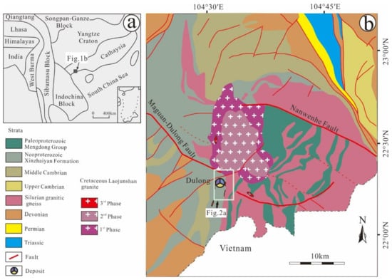 The Dulong Sn-Zn-In polymetallic deposit in the Yunnan province, Southwestern China, contains 5.0 Mt Zn, 0.4 Mt Sn, and 7 Kt In [], and is one of the largest Sn-Zn-In deposits in South China. Previous radioisotopic dating results have shown that Sn-Zn polymetallic mineralization in the Dulong mine area is genetically related to the Late Cretaceous Laojunshan granites [,,,]. However, the Laojunshan granites form a multi-phase pluton. Cassiterite, as the main Sn-bearing mineral, is well developed at Dulong and it co-exists with the sulfides–oxide–silicate assemblage, but it remains unclear whether multi-stage Sn mineralizations at Dulong are related to the Laojunshan multi-phase pluton.