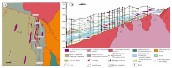 (a) Geological map of the Dulong Sn-Zn polymetallic skarn deposit []. (b) S–N cross section from the Lazizhai ore block (S) to the Tongjie ore block (N), modified after (geological data from Yunnan Hualian Mineral Exploration Co. Ltd., 2016; Qujing, China).