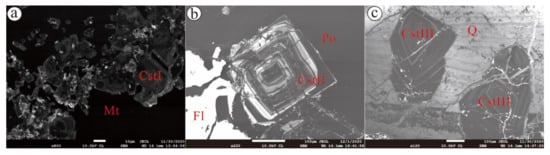 CL is a powerful tool in revealing the complicated microtextures of minerals that are otherwise not obvious [,,,,]. With regard to CL images, three types of cassiterite were identified in the Dulong Sn-Zn-In polymetallic deposit. Each type displays distinctive CL textures and trace element patterns. The CL intensity of Cst I-II cassiterites are much higher than Cst III cassiterites (Figure 4). Previous studies showed that Al, Ti, and W are the luminescence activators of cassiterite, but that Fe quenches the luminescence [,]. Average contents of Al (~358 ppm), W (~1912 ppm) in Cst I and Ti (~374 ppm) in Cst II are slightly higher than those in Cst III (~163.7 ppm Al; ~17.4 ppm Ti; ~402 ppm W), however, Cst III has higher contents of Fe (~7960 ppm) than Cst I (~6297 ppm) and Cst II (~2586 ppm). These activator elements should have generated more intense luminescence in Cst-I and Cst II. In contrast, Cst III is nonluminescent.