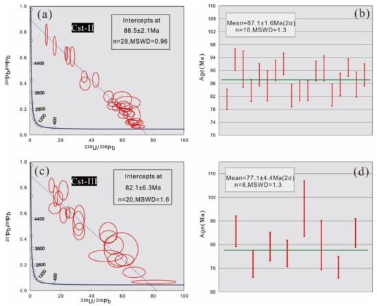 Twenty spot analyses were carried out for sample DL18-123 from the quartz vein (Table 1). The cassiterite grains have countable U and low Th contents. The composition of the 20 ablated spots on the cassiterite grains varies from 0.01 to 0.2 ppm total Pb, <0.04 ppm Th, and 0.15–1.67 ppm U, respectively. The analytical spots gave a Tera–Wasserburg U–Pb lower intercept age of 82.1 ± 6.3 Ma (2σ, n = 20, MSWD = 1.6) (Figure 5c). The analyses yielded a weighted mean 206Pb/238U age of 77.7 ± 4.4 Ma (2σ, n =8, MSWD = 1.3) (Figure 5d) after 207Pb-based correction, which agrees well with the Tera-Wasserburg U–Pb lower intercept age within error. This indicates that the age can accurately represent the crystallization age of the cassiterite in the quartz vein.