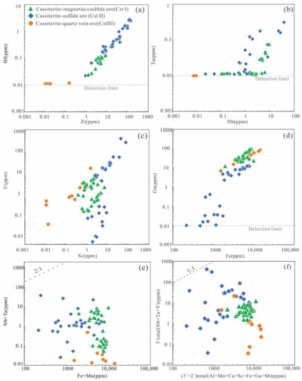 The controlling factors for trace elements in hydrothermal cassiterites include temperature, pressure, pH, Eh, fluid compositions, etc. []. The contents of high field strength elements (HFSEs: Zr, Nb, Ta, Hf) decrease from the skarn cassiterite (Cst I–II) to the quartz veins (Cst III) in the Dulong deposit. This distinct decrease in the content of HFSEs can be attributed to controlling factors governing the partitioning of these HFSEs elements between cassiterite and ore-forming fluid in the different mineralizing environments. One possibility for the change in HFSE solubility may be that skarn cassiterite formed under high temperature whereas the quartz vein cassiterite formed under a low temperature environment. It can be found from the Dulong ore blocks that porphyry formed at a shallower depth compared with concealed granite (Figure 2b). The formation of the porphyritic granite shows a relatively lower temperature environment relative to the inner medium- to fine-grained granite, which is supported by previous studies [,,]. Thus, the formation of skarn cassiterite (Cst I–II) may be mainly related to the concealed granite and the formation of quartz vein cassiterite (Cst III) is mainly related to porphyry granite. In hydrothermal fluids, the HFSEs are activated as F-complexes, whose solubility depends on pH, fluorine activity, temperature and pressure [,]. The decrease of temperature, and solubility of F-complex, can lead to lower HFSE contents in quartz vein cassiterites as opposed to skarn cassiterites.