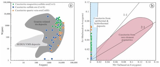 (a) Binary plot of Fe vs. W in cassiterite from the Dulong district (modified by []). (b) Covariation plot of Nb + Ta vs. Fe + Mn in cassiterite grains from the Dulong district (modified by []).
