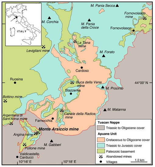 The Monte Arsiccio mine (latitude 43°58′ N, longitude 10°17′ E) exploited one of the several small pyrite ± baryte ± iron oxide orebodies located in the southern sector of the Apuan Alps. These orebodies form a discontinuous mineralized belt of ~10 km with a NE–SW orientation (Figure 1). Their geological setting and geochemical features have been summarized in previous works (e.g., [8,9]). From northeast to southwest, the main mining sites were Fornovolasco, Buca della Vena, Canale della Radice, Monte Arsiccio, and Pollone mines.