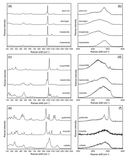 Raman spectra of the studied sulfates in the region between 100 and 1500 cm−1 and between 2500 and 4000 cm−1. (a,b) Alum-(K), alunogen, khademite, and melanterite; (c,d) coquimbite, halotrichite, and rӧmerite; (e,f) goldichite, krausite, and voltaite.