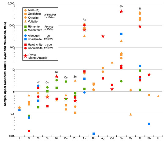 Concentrations of trace elements in the studied sulfates normalized to the Upper Continental Crust values of Taylor and McLennan [40]. Red stars represent the average values of 135 spot analyses by LA-ICP-MS of the Monte Arsiccio pyrite, taken from George et al. [9].