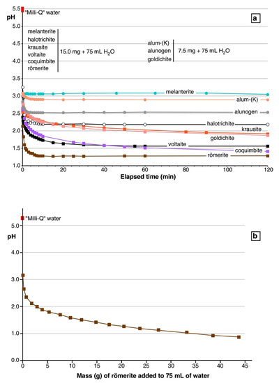 The results of the mineral dissolution experiments are shown in Figure 6, which reports the pH value vs. elapsed time. All experiments showed a significant decrease of pH during the first 30 s from the beginning of the dissolution (Figure 6a). This decrease (measured from the pH of the Milli-Q water) varied from 2.44 pH units for melanterite to 3.67 pH units for römerite. After 120 min, the pH of the solutions stabilized around a nearly constant value. Halotrichite and melanterite, iron sulfates nominally containing Fe2+ and no Fe3+, dissolved, completely giving a final solution with pH of 2.18 and 3.04, respectively. Frau [17] obtained very similar results dissolving melanterite (from the Genna Luas mine, Sardinia, Italy) and its synthetic analogue at a concentration of 200 g/L. Valente and Gomes [18] dissolved halotrichite and melanterite + rozenite from the Valdarcas mine (Portugal), at a concentration of 20 g/L obtaining pH values of ~ 3.3 and 3.6, respectively. Alunogen and alum-K) dissolved completely, giving a final solution with pH of 2.53 and 2.89, respectively. Coquimbite, goldichite, and krausite, sulfates nominally containing just Fe3+ and no Fe2+, dissolved only partially, giving a final solution with a pH of 1.41, 1.87, and 1.91, respectively. Römerite and voltaite, sulfates containing both Fe2+ and Fe3+, dissolved completely, giving a final solution with pH of 1.28 and 1.56, respectively.