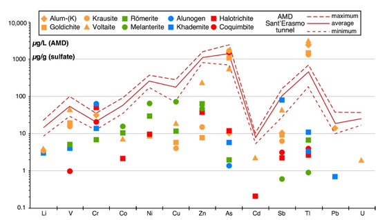 As reported in the Introduction, the hydrogeological setting of the Monte Arsiccio mining area, coupled with the high rainfall of the Apuan Alps, favors an intense interaction between meteoric water and orebodies, promoting the formation of AMD. Acidic effluents come out from many adits of the Monte Arsiccio mine but are particularly abundant at the Sant’Erasmo tunnel [10]. Indeed, this is the lowest level (485 m a.m.s.l.) of the whole mining area collecting the majority of its internal waters. The geochemistry of the AMD flowing out of the Sant’Erasmo tunnel, along with other physicochemical parameters (e.g., temperature, pH, Eh, electrical conductivity, flow rate, etc.), is well constrained [10,12]. In Figure 7, the maximum, minimum, and average concentration (µg/L) of a series of PTEs, measured over the period 2014–2016, in the AMD from the Sant’Erasmo tunnel, are reported, along with the concentration (µg/g) of the same elements in the studied sulfates.