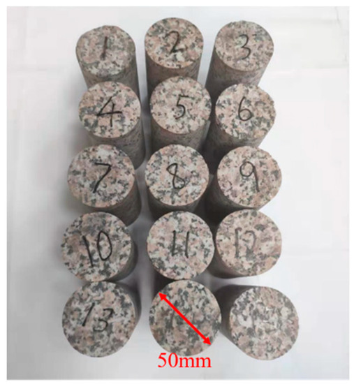 The granite was selected from Queshan County, Zhumadian, and all samples were cut and processed from a relatively complete ore body. Firstly, a cylindrical core with a diameter of 50 mm was drilled, and then a cylindrical specimen with a height of 100 mm was cut. A total of 15 granite specimens were prepared in this experiment, as shown in Figure 1. The stone grinder and sandpapers were used to grind both ends of the test piece carefully so that the parallelism of the upper and lower surfaces was within 0.05 mm, and the surface flatness was within 0.02 mm. The samples had good integrity and uniformity, and the average uniaxial compressive strength was 110 MPa. The X-ray fluorescence (XRF) test shows that SiO2 has the highest content in granite, and the detailed content of other substances is shown in Table 1.