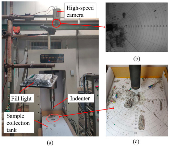 The uniaxial compression test of granite specimens was carried out using the method of force loading. The experimental loading rates were 1, 2, 3, 4, 5 kN/s, with five loading rates and three tests for each loading rate. The unloading process had the same rates as the loading process. This test uses the TAW-3000 hydraulic servo test system (Changchun City Chaoyang Test Instrument CO., LTD., Changchun, China) (as shown in Figure 2a). The testing machine has a portal frame with a stiffness greater than 5 GN/m, which can provide an axial force of 3000 kN and a resolution of 20 N. The resolution of the axial deformation of the specimen is 0.5 μm. The high-speed camera used in this experiment has a shooting frequency of 800 Hz and a shooting area of 400 mm × 500 mm, which is used to record the horizontal velocity of the broken particles’ movement. The focal length of the lens used in this experiment was 50 mm.