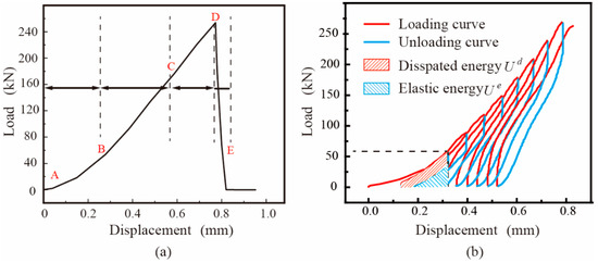 In the process of the uniaxial compression of the specimen, the displacement of the indenter changed with the load. This change process is usually divided into four stages [31]: the crack compaction stage, elastic stage, microcrack stable-growth stage, and the unstable cracking stage. The accelerated expansion phase and the post-peak segment are shown in Figure 3a. At the same time, energy accumulates, dissipates, and releases inside the specimen. Regardless of the heat exchange between the specimen and the environment, the relationship between input energy, elastic energy, and dissipation energy is as follows [32]: