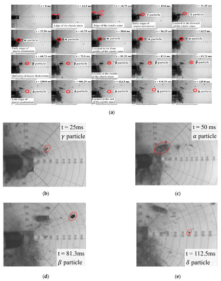 The following information can be obtained through observation and analysis of high-speed photography images (Figure 5). In the early stage of macro-destruction, the smaller particles (γ particle) were ejected from the surface of the specimen first. Such particles are located at the front of the detrital cluster and move extremely fast. In the early stage of macro-destruction, the largest particles ( particle) peeled off the surface of the specimen. These particles are located in the front and middle part of the detrital cluster and move faster. In the middle stage of the macro destruction, the larger particles (β particle) peeled off from the surface of the specimen. Such particles are located in the middle of the detrital cluster and move slowly. At the end of macro destruction, the smallest particles (δ particle) were produced, which are located at the back of the detrital cluster and move very slowly. The generation time, spatial location and movement characteristics of the four types of particles were summarized in Table 2.