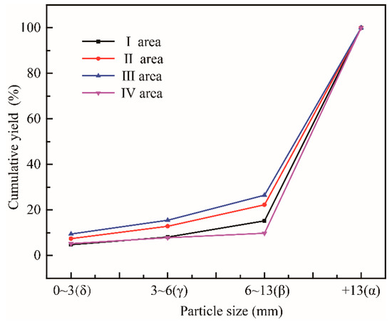 In order to facilitate the analysis and study of the movement characteristics of different sizes of uniaxial destruction fragments (at the same time limited by the camera resolution), the fragments obtained after the uniaxial compression experiment were divided into four groups according to the particle size, namely α particles, β particles, γ particles and δ particles [33]. The size of the fragments were divided into +13 mm, 6–13 mm, 3–6 mm, and −3 mm, as shown in Figure 4. Since the fragments were often irregular, the sieving result was used as the measurement and calculation standard during measurement.