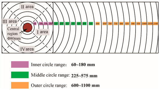 The surface of the specimen was painted. The debris larger than 6 mm can be divided into surface particles and internal particles according to whether there is a color on the surface. The mass of the two types of particles in area I along the radial direction is counted. On the whole, there is no apparent difference between Figure 12 and Figure 13, which indicates that most of the particles larger than 6mm are surface particles; that is, at least one surface is the surface of the test specimen. On the contrary, it is easier to compare the difference between Figure 12 and Figure 13 from the spatial mass distribution of the internal particles. That is to say, the mass of the particles at each distance in Figure 14b is the difference between the mass of the particles at the corresponding distance in Figure 12 and Figure 13. Therefore, although Figure 12b and Figure 13b are relatively close in morphology, there are differences in the number and mass of particles.