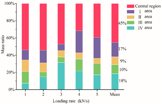 Theoretically, the distribution of fragments in the four areas after the uniaxial compression failure of homogeneous materials is the same. However, due to the differences in the internal cracks of the materials, the mass distribution of different specimens after crushing is random. Figure 8 shows the proportion of fragments in each area after crushing the five groups of specimens. In most cases, the central area accounts for the largest proportion, with an average mass proportion of 45%. The loading rate variation range of the center area mass between 1–4 kN shows a decreasing trend with the loading rate increase. The mass proportions of the remaining four regions show strong randomness in a single experiment, with an average mass proportion of 10 to 20%. If the four peripheral areas are regarded as a whole, it is opposite to the changing trend of the mass of the central area, and its total mass shows a law of increasing with the increase of loading rate.