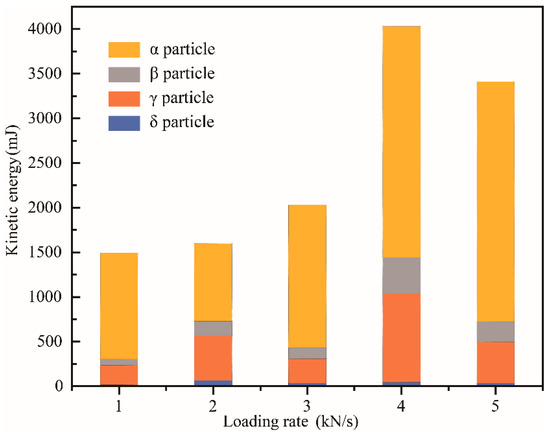 The kinetic energy of the four kinds of particles generated by the crushing of the specimen at different loading rates is shown in Figure 9. It can be seen that the total kinetic energy increases with the increase of the loading rate within the range of loading rate of 1–4 kN/s. Furthermore, the main factor affecting the total kinetic energy is the kinetic energy of α particles. The relationship between the kinetic energy of other types of particles and the loading rate is not obvious. When the loading rate is 5 kN/s, the total kinetic energy decreases, which is mainly affected by the decrease of the kinetic energy of α particles.