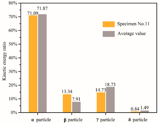 The proportion of kinetic energy of various particles in specimen 11 can be obtained by summarizing the data in Table 5. The distribution law of kinetic energy can be seen in Figure 10; the kinetic energy proportions of the four types of particles are ranked from high to low as > > > . The kinetic energy of α particles accounts for about 70%, the kinetic energy of γ particles accounts for close to 20%, the kinetic energy of β particles accounts for close to 10%, and the kinetic energy of δ particles accounts for about 1.5%. Comparing the average values of specimen 11 and specimens 1 to 15 shows that the kinetic energy distribution of various particles of a single specimen is not significantly different from the overall distribution. The two indicators that affect the magnitude of kinetic energy are speed and quality. The α-type particles have the largest mass, and the γ particles have the largest velocity. Since the mass of alpha particles is more than an order of magnitude higher than that of gamma particles, the speed of γ particles is several times that of alpha particles. This has led to massive particles becoming the main contributor to kinetic energy.