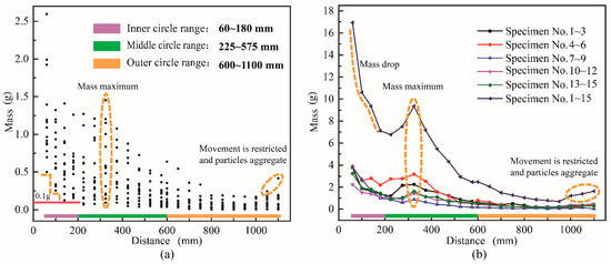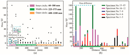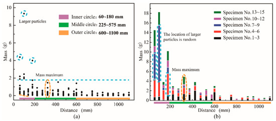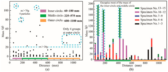 The spatial distribution of large particles shows strong randomness, and the probability of super large particles is small. It can be seen from Figure 12a that there are only four particles larger than 70 g in all of the data, but they contribute most of the mass of the inner circle and the middle circle. Among more than 300 sets of data, there were only 16 sets of super-large particles with a mass greater than 20 g. There were only four groups of super large particles in the outer circle, and the mass was less than 50 g. From the spatial distribution of large particles, it can be seen that the input energy of this uniaxial compression and crushing is limited, which is not enough to push the super large particles to a more distant area. The input energy may be related to the material properties and loading rate, and it is worthy of further exploration. For 15 sets of experiments, larger loading rates are more likely to produce large splashing particles. As shown in Figure 12b, the mass of large particles produced by specimens 10–15 (loading rate 4–5 kN/s) is larger than that of specimens 1–9 (loading rate 1–3 kN/s).