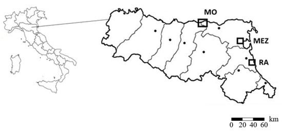 The selected study areas were located in the eastern Padania Plain, and specifically in Modena (MO sites), Ferrara (MEZ sites) and Ravenna (RA sites) provinces of Emilia Romagna region, Italy (Figure 1). These sites were selected for their high representativeness of the Padania Plain of Emilia Romagna region, which is characterized by lands addressed for industrial crops.