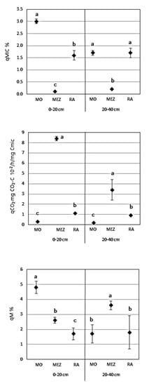 The qMIC trend was MO > RA > MEZ in the topsoil, while in the subsoil MEZ showed the lowest qMIC values and no differences occurred between MO and RA (Figure 2). For both soil layers, the qCO2 showed the highest and lowest values in MEZ and MO, respectively (Figure 2). The qM of the topsoil showed the highest values in MO and the lowest ones in RA. In subsoil, instead, MEZ had a higher qM compared to MO and RA (Figure 2).