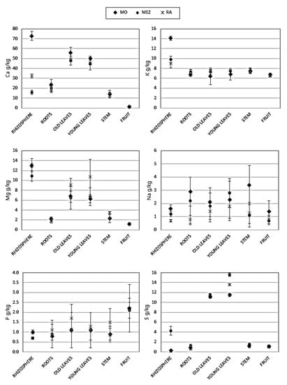 Ca, K, Mg, Na, P and S concentrations in rhizosphere soil, root, old and young leaves, stem and fruit of processing tomato plants cultivated in Modena (MO), Ferrara (MEZ) and Ravenna (RA) provinces, Emilia Romagna Region, Italy. Error bars represent standard error of the mean.