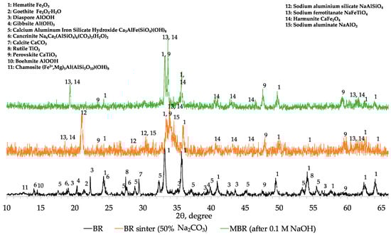 Comparing the XRD profiles of BR, modified BR and the 1st cinder fraction with a particle size lower than 0.2 mm (
