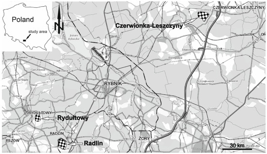 Location of the studied burning coal-dumps of Upper Silesia in the Rybnik region.