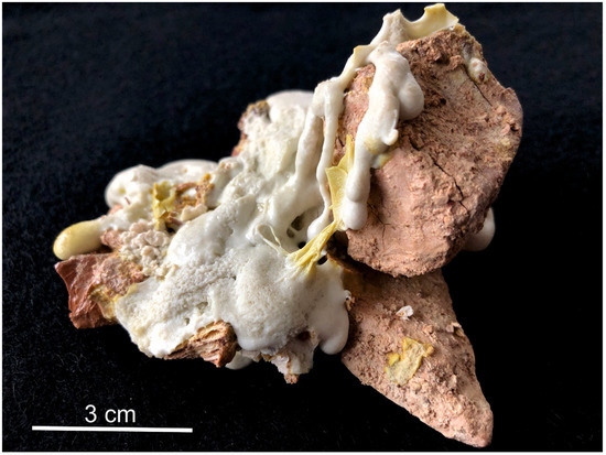 The least commonly reported mineral of high-temperature sulfate assemblages on burning coal dumps is anhydrous magnesium sulfate. So far, it has been mentioned only from Kopeysk near Chelyabinsk, South Ural Mountains, Russia [17] and is still very little known. A phase with this chemical composition is not on the list of officially recognized minerals. On the other hand, minerals representing hydrated magnesium sulfates from MgSO4·H2O (kieserite) to MgSO4·7H2O (epsomite) are well known. Anhydrous MgSO4 has been found by us on burning heaps in the Rybnik region in Radlin and Rydułtowy in the hottest parts of the exhalations. Sporadically it forms monomineral aggregates visually indistinguishable from millosevichite or steklite. They have the typical appearance of high-temperature sulfates from this environment and form foamed, vesicular masses of white or yellowish color (Figure 6). This phase more often occurs as a very fine admixture in millosevichite or steklite aggregates where it can only be detected using a microprobe. Anhydrous MgSO4 is probably more common on burning heaps than we have found out, but it is very difficult to identify. The presence of this phase cannot be detected with the use of PXRD, which is routinely used in mineralogical practice as it is x-ray amorphous. According to van Essen et al. [18] amorphous MgSO4 can recrystallize above 276 °C but only when a small amount of water is present (0.2 water molecule per MgSO4 molecule). We did not observe such recrystallization in our samples. Anhydrous MgSO4 is not stable in ambient conditions and quickly hydrates, first to kieserite MgSO4·H2O and then to more hydrated phases. Kieserite, possibly also crystallizing as the primary phase from fire gases at lower temperatures or by evaporation of water solution, is known from many burning coal-heaps [8,17,19]. It is also quite common in Upper Silesia, recorded at Czerwionka-Leszczyny, Radlin and Rydułtowy. The more strongly hydrated magnesium sulfates are of an obviously secondary nature. Hexahydrite MgSO4·6H2O is the most commonly found mineral of this group on the burning coal heaps. Its accumulation in the form of white, powdery or fluffy blooms can cover an area of several square meters on the cooled parts of heaps. Epsomite MgSO4·7H2O is rare and is only found in areas with high humidity. In dry, sunny places it quickly dehydrates to hexahydrite. Even more rare is starkeyite MgSO4·4H2O, sometimes found as a minor component of the sulfate assemblages.