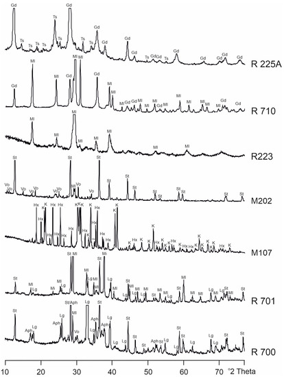 Selected XRD patterns of anhydrous sulfates from the Upper Silesian burning coal-dumps. Gd—godovikovite, Ts—tschermigite, Ml—millosevichite, St—steklite, Vo—voltaite, K—kieserite, Hx—hexahydrite, Aph—aphthitalite, Lg—langbeinite.