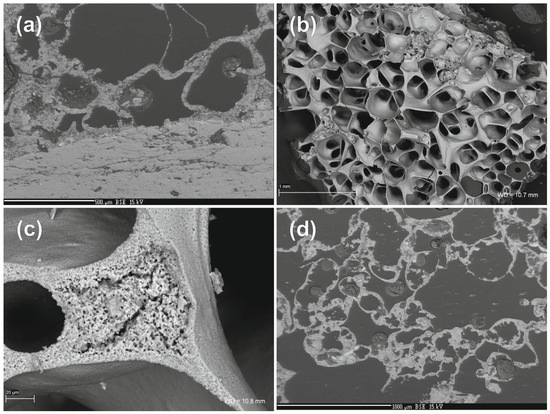 Rapid crystallization also explains the formation of their typical vesicular structure, when the solidified, gas-saturated, liquid or semi-liquid mass closed the gas bubbles in the form of a thin film. The SEM image shows that first the outer zone of such a film solidifies, and then the masses located inside crystallize (Figure 8c,d).