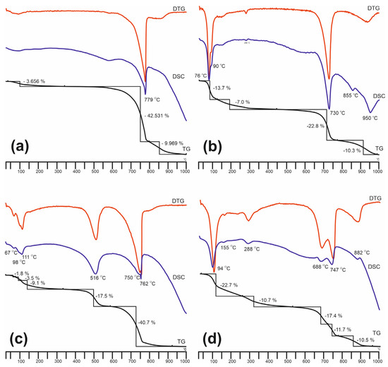 Thermal behavior of sulfate minerals. (a) millosevichite, (b) steklite, (c) godovikovite, (d) unnamed MgSO4.
